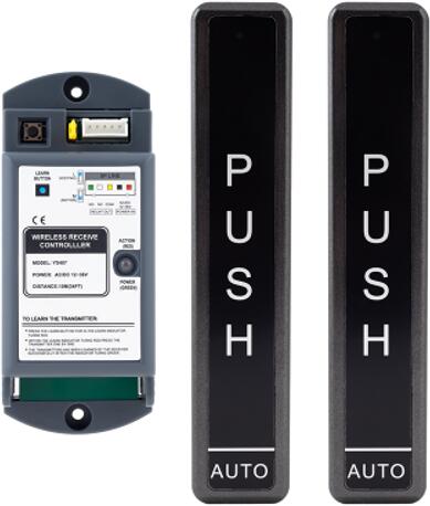 YS407  egy távirányítós nyitógomb adó-vevő csomag automata tolóajtó operátor szettekhez. A vevőegység beépíthető, felületre szerelhető, LED-es visszajelzéssel rendelkezik. A kettő adó hosszúkás, felületre ragasztható, közelítő érzékelős nyitógomb. Alkalmazható mind tolóajtó automatikákhoz, mind elektromos ajtónyitókhoz, mind elektromos zárakhoz.